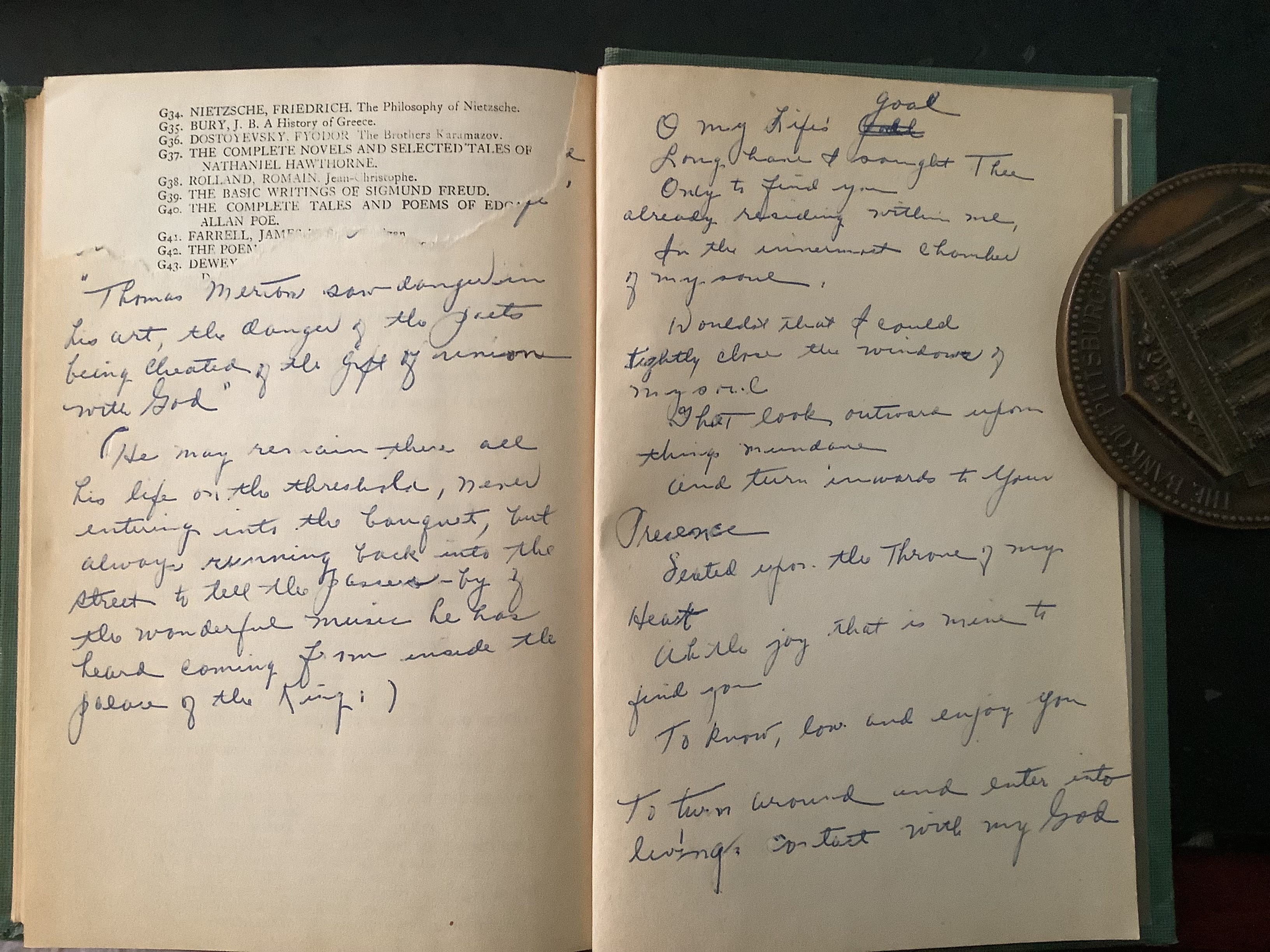 I found three intriguing scribbles: on the left page: (1) in quotation marks, and (2) in parentheses. And on the right: (3) a poem. What he tore from the top of the left page is a mystery.